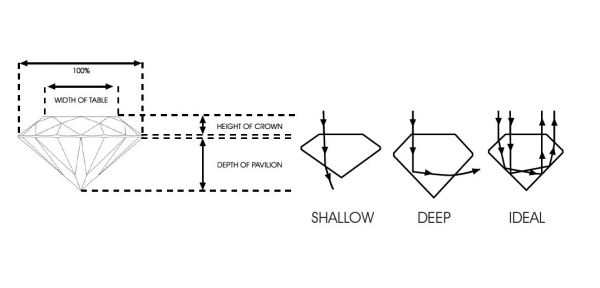 The proportion of each individual diamond directly affects its brilliance and appeal. Diamonds with excellent proportions, symmetry and polish optimise their interaction with light. Often diamonds are cut to retain weight rather than excellent proportion, as this may sometimes yield a slightly higher price as the expense of quality.